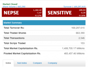 नेप्से परिसूचक साताको चौथो दिन बुधवार १ दशमलव ४७ अङ्कले घटेर ११८२ दशमलव ४२ अङ्कमा बन्द भएको छ । कारोबार रकम १६ करोड ९२ लाख पुगेको छ ।