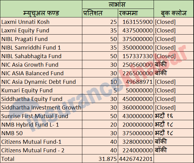 लाभांश घोषणा गरेका १६ म्युचुअल फण्डको औषत लाभांस ३१ प्रतिशत रहेको छ । लाभांस घोषणा गरेका फण्डको आकार १४ अर्ब २४ करोडको रहेको छ । फण्डहरुले इकाईधनीहरुलाई यसै वर्ष ३१ प्रतिशत फिर्ता दिन सफल भएका हुन् । केहि फण्डले इकाईधनीलाई उक्त लाभांस वितरण गरिसकेका छन् भने केहि प्रकृयाँमा छन् ।