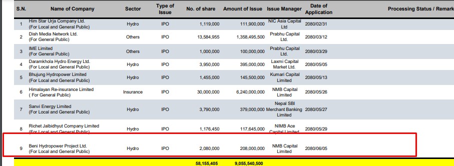 काठमाडौं । बेनी हाइड्रोपावर प्रोजेक्ट लिमिटेडले आइपीओ निष्काशन गर्नका लागि नियामक निकाय नेपाल धितोपत्र बोर्डले निवेदन दिएको छ । कम्पनीले २० लाख ८० हजार कित्ता आइपीओ निष्काशन गर्नका लागि असोज ५ गते सेबोनमा निवेदन दिएको हो । आइपीओ निष्काशन तथा विक्री प्रबन्धकमा एनएमबि क्यापिटल लिमिटेड रहेको छ ।