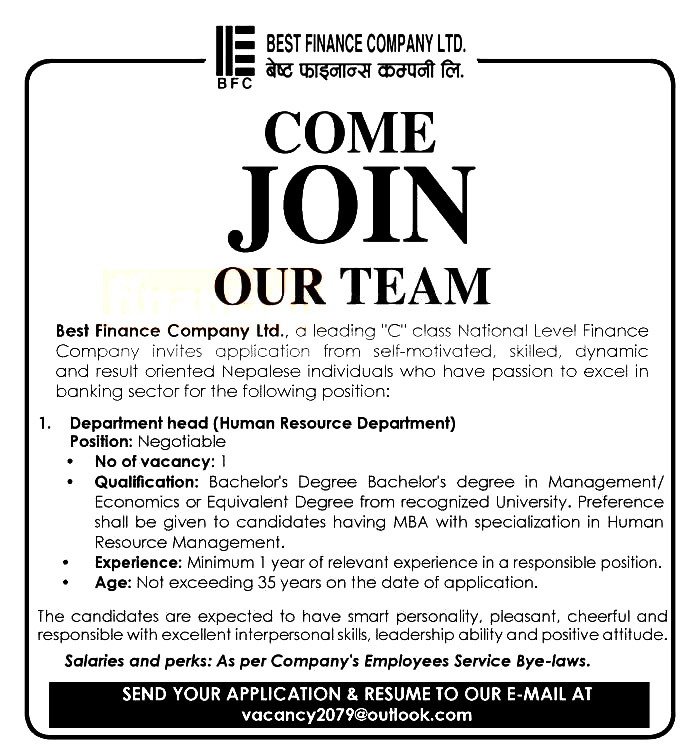 काठमाडौं । बेष्ट फाइनान्स कम्पनी लिमिटेडले कर्मचारीको माग गरेको छ । कम्पनीले डिपार्टमेन्ट हेड पदको लागि कर्मचारी माग गरेको छ । उक्त पदका लागि कम्पनीले व्यवस्थापन विषयमा स्नातक तह उर्तिण गरेको हुनुपर्ने जनाएको छ ।