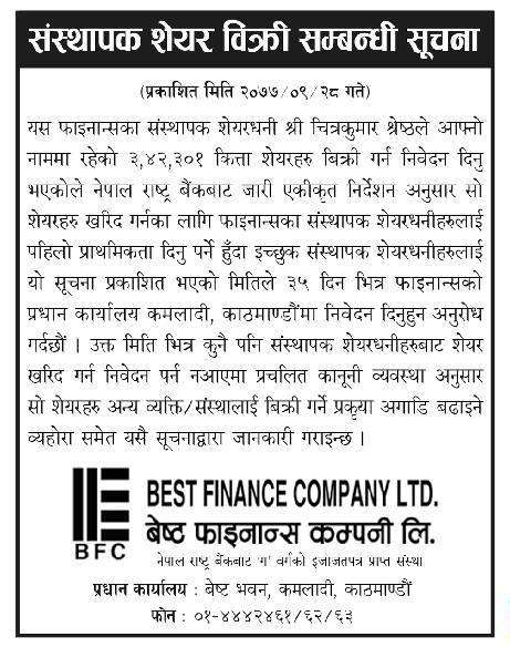 काठमाडौं । बेष्ट फाइनान्स कम्पनी लिमिटेडले ३ लाख ४२ हजार ३ सय एक कित्ता संस्थापक शेयर बिक्री गर्ने भएको छ । फाइनान्स कम्पनीले एक सूचना जारी गर्दै यस्तो जनाएको छ ।