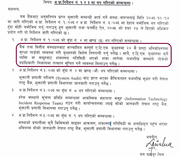 बैंकिङ प्रणालीमा कुनै किसिमको साइबर आक्रमण अथवा शंकास्पद गतिविधि वा अनाधिकृत काम भएमा तथा पहुँच भएमा तत्काल राष्ट्र बैंकको भुक्तानी प्रणाली विभागमा जानकारी गराउन समेत निर्देशन दिएको छ ।