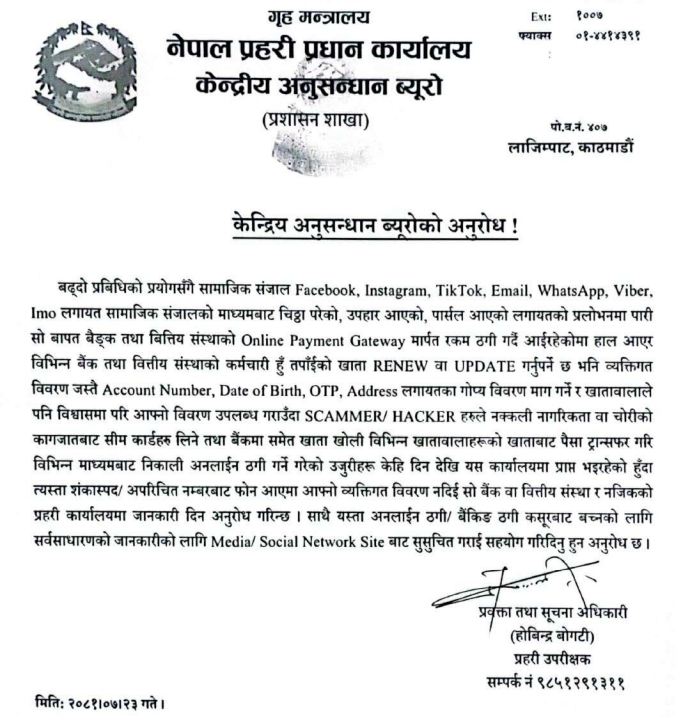 बोगटीद्वारा जारी सूचनामा हाल विभिन्न बैंक तथा वित्तीय संस्थाका कर्मचारी हुँ तपाइँको खाता नवीकरण वा अद्यावधिक गर्नुपर्नेछ भनी सर्वसाधारणबाट व्यक्तिगत विवरण माग्नेहरु गिरोह सक्रिय रहेको पाइएको उल्लेख छ। ‘उनीहरुले बैंक अकाउन्ट नम्बर, जन्म मिति, ओटीपी, ठेगानालगायतका गोप्य विवरण माग गरेका छन्’, सूचनामा भनिएको छ, ‘खातावालाले पनि विश्वासमा परी आफ्नो विवरण उपलब्ध गराउँदा स्क्यामर र ह्याकरले नक्कली नागरिकता वा चोरीको कागजातबाट सीम कार्डहरु लिने तथा बैंकमा समेत खाता खोली विभिन्न खातावालाको खाताबाट पैसा ट्रान्सफर गरी विभिन्न माध्यमबाट निकाली अनलाइन ठगी गर्ने गरेका छन्।’