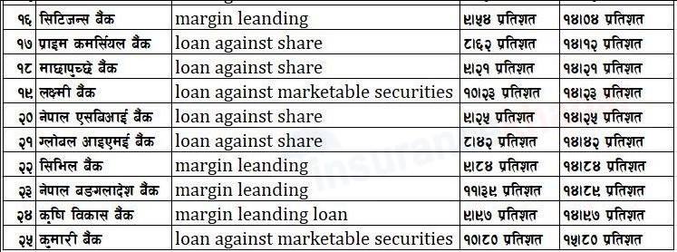 त्यसैगरी सबैभन्दा महङगो शेयर धितोमा कर्जा कुमारी बैंकले प्रदान गर्दै आएको छ । बैंकले न्युनतम १० दशमलव ८० प्रतिशत ब्याजदरदेखि अधिकतम १५ दशमलव ८० ब्याजदरमा कर्जा प्रदान गर्ने गरेको छ । नेपाल बङलादेश बैंकले न्युनतम ११ दशमलव ३५ प्रतिशत ब्याजदरदेखि अधिकतम १४ दशमलव ८९ प्रतिशत ब्याजदरमा शेयरधितो कर्जा प्रदान गर्ने गर्दछ ।