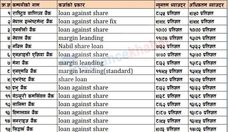 राष्ट्रिय वाणिज्य बैंकले न्युनतम ८ दशमलव २५ प्रतिशतदेखि अधिकतम ९ दशमलव ५० प्रतिशत ब्याजदरमा शेयरधितो कर्जा दिने गरेको छ भने नेपाल बैंकले न्युनतम ११ दशमलव ०४ प्रतिशत ब्याजदरदेखि अधिकतम १२ दशमलव ०१ प्रतिशतसम्म उक्त कर्जा प्रदान गर्ने जनाएको छ ।