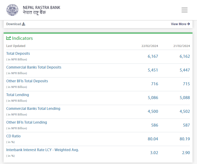 बिहिबार सम्म वाणिज्य बैंकमा निक्षेप ५४ खर्ब ५१ अर्ब पुगेको छ भने वाणिज्य बैंकबाट ४५ खर्ब  कर्जा प्रवाह भएको छ । सिडी रेसियो घट्दै ८०.०४ प्रतिशत कायम भएको छ भने अन्तर बैंक ब्याजदर ३.०२ प्रतिशत छ। अघिल्लो दिन सिडी रेसियो ८०.१९ प्रतिशत थियो ।