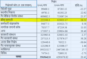 कर्मचारी सञ्चयकोषको निक्षेप संकलनमा भने खासै सुधार हुन सकेको देखिदैन । तर नागरिक लगानीकोष तथा अन्य कोषहरुको निक्षेप संकलन भने धेरैले बढेको पाइन्छ । बैंक तथा वित्तीय संस्थाहरु सँग सबैभन्दा धेरै निक्षेप व्यक्तिहरुको छ । व्यक्तिहरुको मात्रै बैंकहरुमा २४ खर्ब ६७ अर्ब रुपैयाँ जम्मा भएको पाइन्छ ।