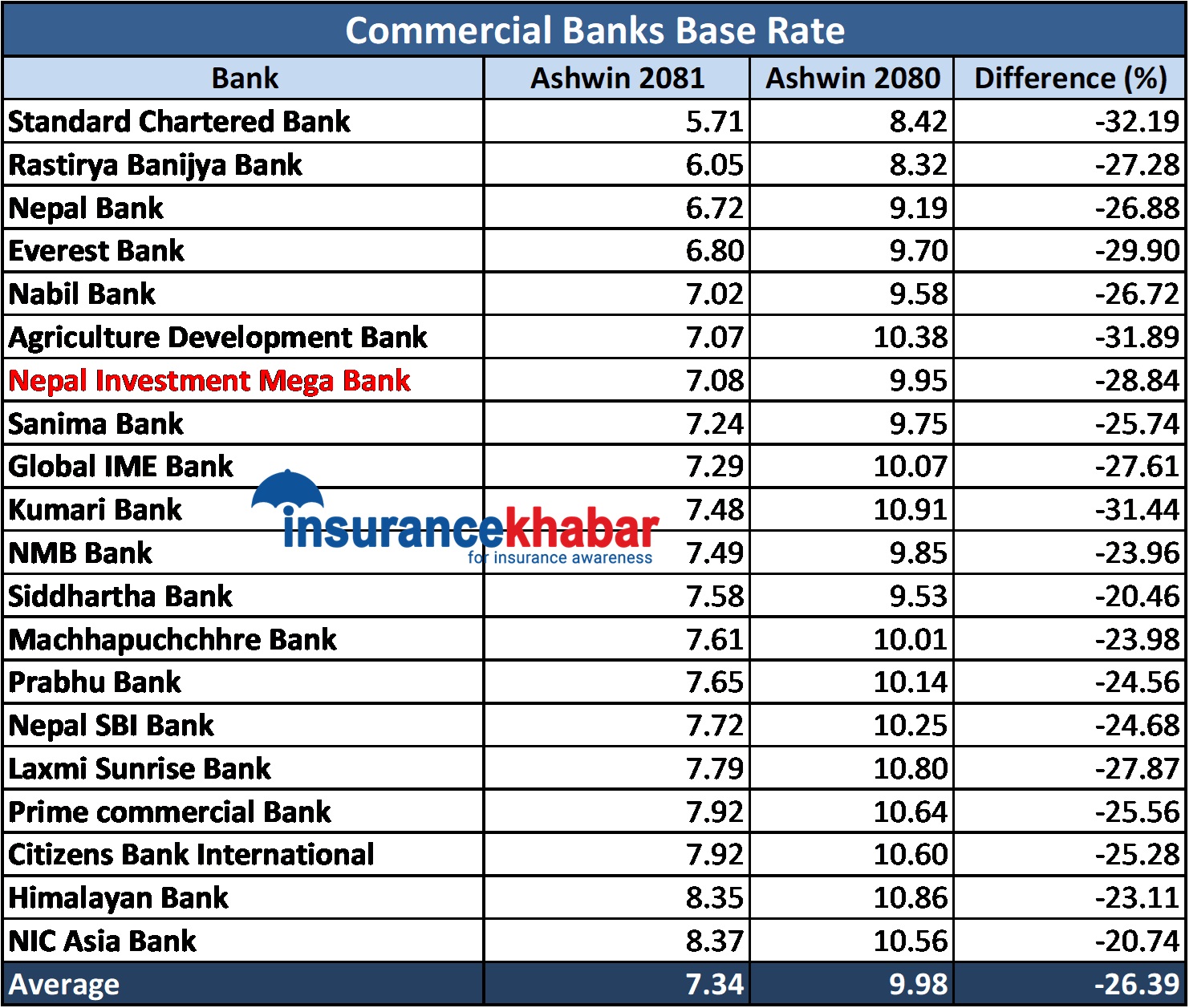 वित्तीय विवरणअनुसार चालु आर्थिक वर्षको असोज मसान्तसम्म २० वटा वाणिज्य बैंकको औसत आधारदर ७.३४ प्रतिशतमा झरेको छ। अघिल्लो आर्थिक वर्षको सोही अवधिमा बैंकहरुको औसत आधारदर ९.९८ प्रतिशत थियो। पछिल्लो एक वर्षको अवधिमा बैंकहरुको औसत आधारदर २६.३९ प्रतिशतले घटेको छ।