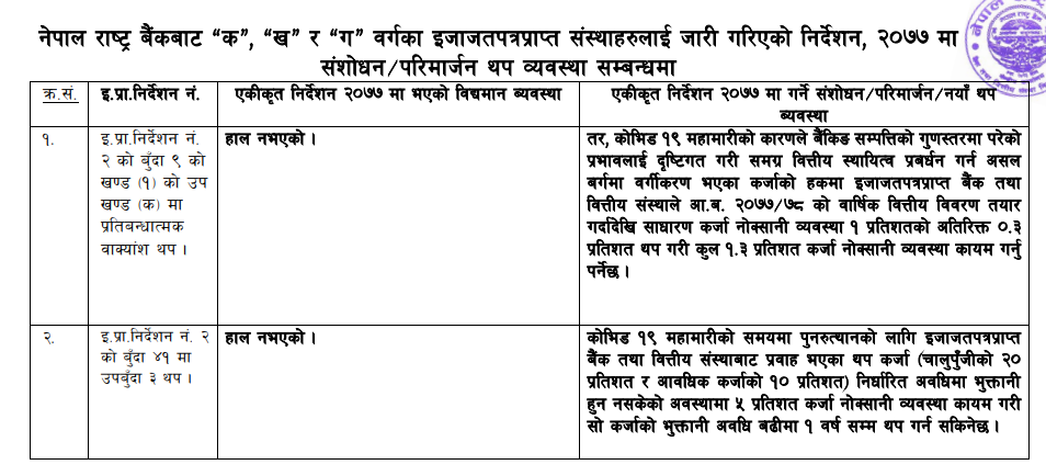 राष्ट्र बैंकले कोभिड १९ महामारीको कारणले बैंकिङ सम्पत्तीको गुणस्तरमा परेको प्रभावलाई दृष्टिगत गरी समग्र वित्तीय स्थायित्व प्रवर्धन गर्न असल वर्गमा वर्गिकरण भएका कर्जाको हकमा बैंक तथा वित्तीय स्थालाई आर्थिक वर्ष २०७७/७८ कै वार्षिक वित्तीय विवरणमा साधारण कर्जा नोक्सानीको व्यवस्था एक प्रतिशतको अतिरिक्त ०.३ प्रतिशत थप गरि कुल १.३ प्रतिशत कर्जा नोक्सानी व्यवस्था कामम गर्न निर्देशन दिएको हो ।