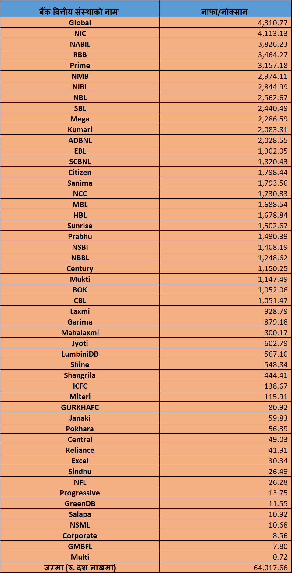 बैंकहरुको १० महिनाको मुनाफा ६४ अर्ब, ग्लोबल र एनआईसीले ४ अर्ब नघाए (कसको कति सूचिसहित)