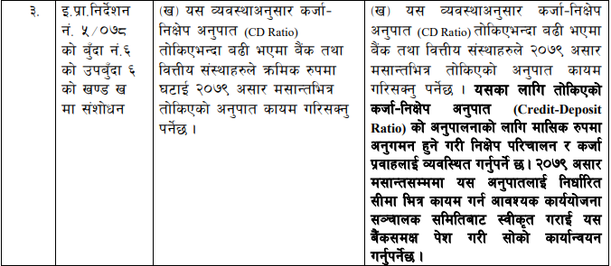 राष्ट्र बैंकले मौद्रिक नीतिमा ‘२०७९ असार मसान्तभित्र कर्जा निक्षेप अनुपात ‘सिडी रेसियो’ ९० प्रतिशतमा झारिसक्नु पर्नेछ’ भनेको थियो । तर हिजो बिहीबार सोही निर्देशनलाई थप तथा परिमार्जन गर्ने क्रममा ‘यसका लागि तोकिएको कर्जा निक्षेप अनुपातको अनुपालनाको लागि मासिक रुपमा अनुगमन हुने गरी निक्षेप परिचालन र कर्जा प्रवाहलाई व्यवस्थित गर्नुपर्नेछ’ भनेको छ । यसै क्रममा २०७९ असार मसान्तसम्ममा यस अनुपातलाई निर्धारित सीमा भित्र कायम गर्न आवश्यक कार्ययोजना सञ्चालक समितिबाट स्वीकृत गराई यस बैंक समक्ष पेश गरी सोको कार्यान्वयन गर्नुपर्नेछ भनिएको छ ।