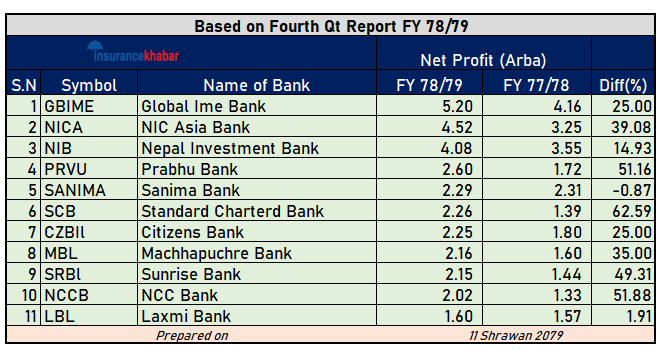 वित्तिय प्रतिवेदन प्रकाशन गरेका ११ वाणिज्य बैंकले ३१ अर्ब १७ करोड खुद नाफा कमाएकोमा अघिल्लो वर्ष २४ अर्ब १८ करोड खुद नाफा कमाएका थिए । औसतमा ११ वाणिज्य बैंकहरुको नाफा २९ प्रतिशतले वृद्धि भएको छ ।