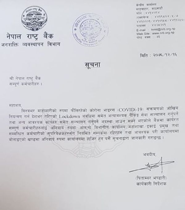 सूचना जारी गर्दै विश्वभर माहामारीको रुपमा फैलिएको कोरोना भाइरस संक्रमणको जोखिम नियन्त्रण गर्न देशभर गरीएको लकडाउन अवधिमा समेत अत्यावश्यक बैंकिङ सेवा सञ्चालन गर्नुपर्ने तथा अन्य आवश्यक कार्यहरु समेत सञ्चालन गर्नुपर्ने अवस्था आउन सक्ने भएकाले बैंकमा कार्यरत सम्बन्धित कर्मचारीको सुपरिवेक्षकहरुसँग नियमित सम्पर्कमा रहिरहन अनुरोध गरेको हो ।