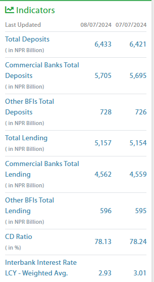 नेपाल राष्ट्र बैंकको पछिल्लो तथ्यांकअनुसार असार २४ गते एकैदिन बैंकिङ प्रणाली १२ अर्ब रुपैयाँ निक्षेप थपिएको हो। योसँगै बैंक तथा वित्तीय संस्थाको कुल निक्षेप ६४ खर्ब ३३ अर्ब रुपैयाँ पुगेको छ। अघिल्लो दिनसम्म कुल निक्षेप ६४ खर्ब २१ अर्ब रुपैयाँ थियो।
