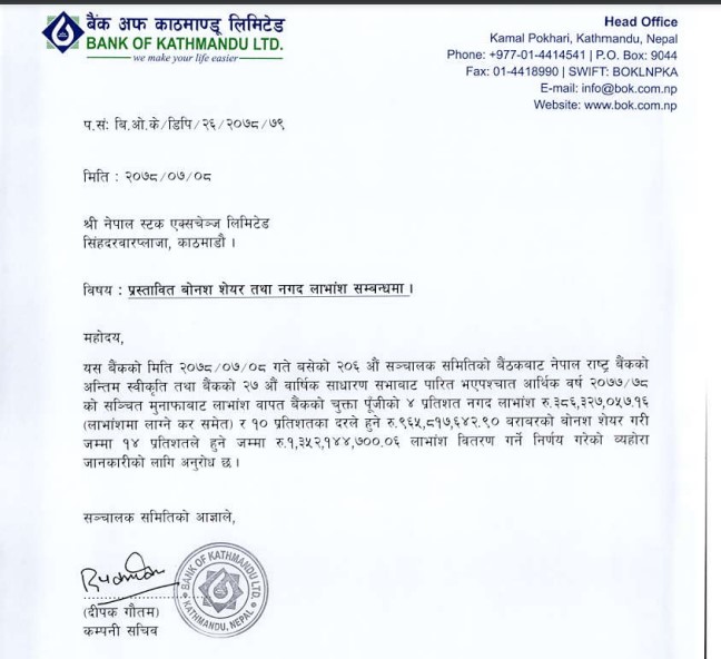 काठमाडौं । बैंक अफ काठमाण्डूले लाभांश प्रस्ताव गरेको छ । कम्पनीको हिजो सोमबार बसेको संचालक समितिको बैठकले आर्थिक वर्ष ७७र७८ को मुनाफाबाट आफ्ना शेयरधनीलाई वितरण गर्ने लाभांश प्रस्ताव गरेको हो ।