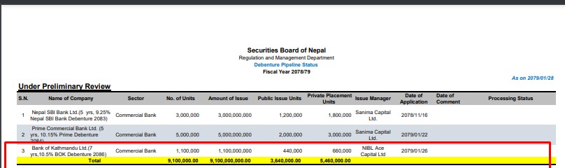 कम्पनीले ७ वर्षका लागि वार्षिक १० दशमलव ५ प्रतिशत ब्याजदरमा बिओके डिबेञ्चर २०८६ नामक ऋण्णपत्र निष्कासन गर्नका लागि सेबोनमा निवेदन दिएको हो । कम्पनीले कुल कित्तामध्ये ४ लाख ४० हजार कित्ता सर्वसाधारणको लागि निष्काशन गर्नेछ भने ६ लाख ६० हजार कित्ता ऋणपत्र व्यक्तिगत तबरबाट विक्री गर्नेछ ।