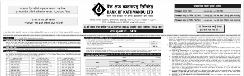 कम्पनीले ७ वर्ष अवधिको १० दशमलव ५० प्रतिशत ब्याजदर रहेको ‘बिओके डिवेञ्चर, २०८६’ नामको ऋणपत्र निष्काशन गर्न लागेको हो । यस ऋणपत्रमा भदौ ७ गतेसम्म आवेदन दिन सकिने छ । उक्त अवधिमा माग बमोजिम आवेदन नपरेमा भदौ १६ गतेसम्म थप हुनेछ ।