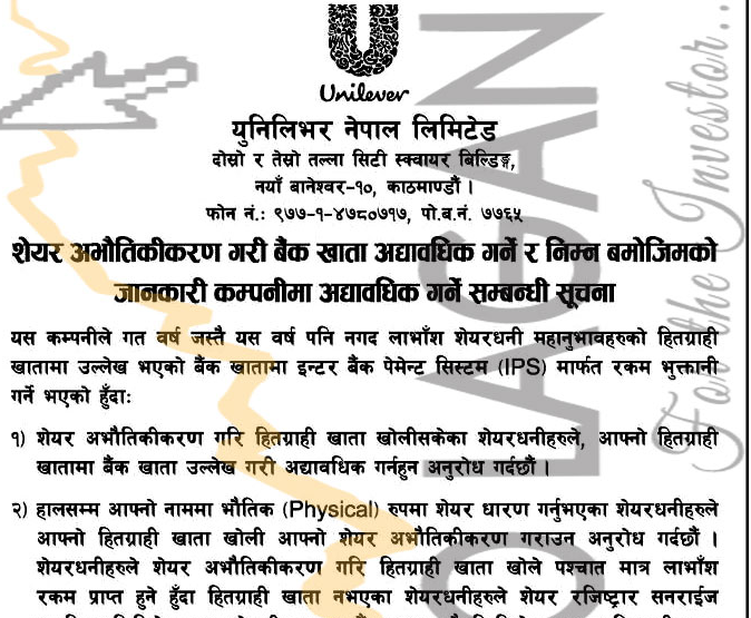 काठमाडौं । युनिलिभर नेपालले आफ्ना शेयरधनीलाई शेयर अभौतिकीकरण गरी बैंक खाता अद्यावधिक गर्न आग्रह गरेको छ । कम्पनीले नगद लाभांश शेयरधनीको हितग्राहीमा उल्लेख भएको बैंक खातामा आईपीएस मार्फत भुक्तानी गर्ने भएको हुँदा खाता अद्यावधिक गर्न आफ्ना शेयरधनीलाई आग्रह गरेको हो ।