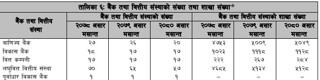 बैंक तथा वित्तीय संस्थाहरुको शाखा संख्या २०७९ असार मसान्तमा १०,५२८ रहेकोमा २०८० असार मसान्तमा ११,५८९ पुगेको छ । २०७९ असार मसान्तमा प्रतिशाखा जनसंख्या २५३२ रहेकोमा २०८० असार मसान्तमा २५१७ कायम भएको छ ।