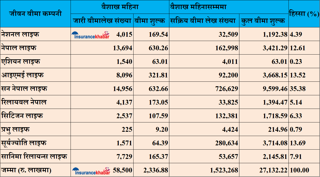 बीमा कम्पनीले जारी गरेको यस्तो बीमालेख संख्या समिक्षा अवधिमा १५ लाख २३ हजार २६८ वटा रहेका छन् । जवकी गएको वर्षको यहि अवधिमा ८ लाख ५४ हजार ६७ वटा पोलिसी जारी गरेका थिए । पोलिसी संख्या ७८ प्रतिशतले बढे पनि बीमा शुल्क आर्जन भने जम्मा ४५ प्रतिशतले मात्रै बढेको छ ।