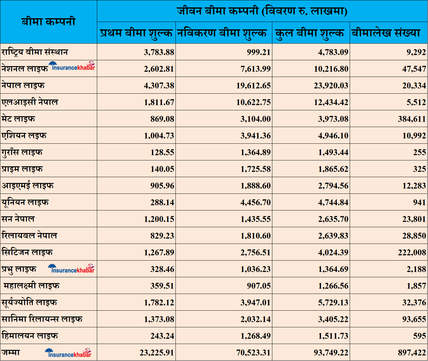 मेट लाइफले ३९ करोड ७३ लाख, सानिमा रिलायन्स लाइफले ३४ करोड ५ लाख, आइएमई लाइफले २७ करोड ९४ लाख, रिलायबल नेपालले २६ करोड ३९ लाख, सन नेपाल लाइफले २६ करोड ३५ लाख, साविक प्राइम लाइफले मर्जर अगाडी १८ करोड ६५ लाख, हिमालयन लाइफले १५ करोड ११ लाख, साविक गुराँस लाइफले १४ करोड ९३ लाख, प्रभु लाइफले १३ करोड ६४ लाख र महालक्ष्मी लाइफले १२ करोड ६६ लाख रुपैयाँ प्रथम बीमा शुल्क आर्जन गरेका छन् ।