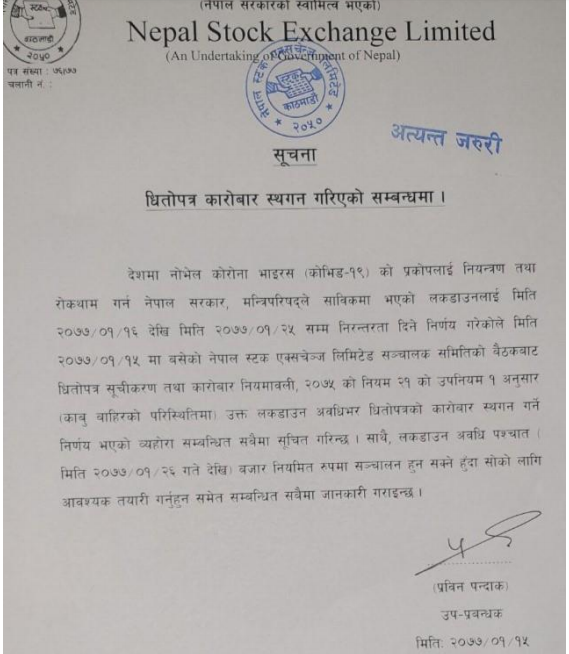 काठमाडौं । नेपाल स्टक एक्सचेन्जले आगामी वैशाख २५ गतेसम्म लकडाउन अवधिभर धितोपत्र कोरोबार स्थगन गर्ने निर्णय गरेको छ । साथै बैशाख २६ गतेदेखि धितोपत्र कारोबार हुने भएकाले शेयरबजार सम्बद्ध सबैजनालाई आवश्यक तयारी गर्न निर्देशन दिएको छ ।