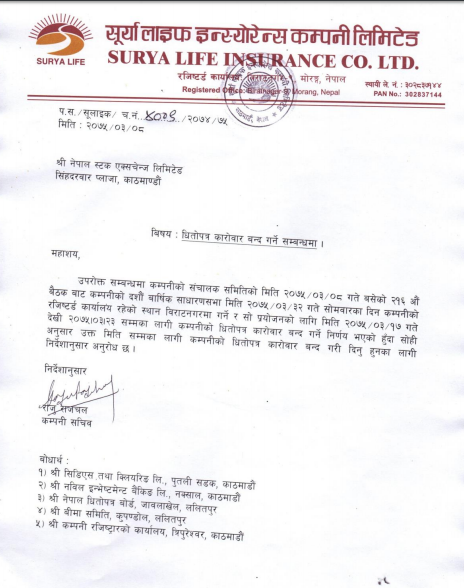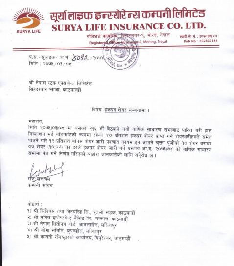 इन्स्योरेन्स खबर/काठमाडौँ: सूर्या लाईफ इन्स्योरेन्स कम्पनीले हाल निष्कासन भई बाडफाटको क्रममा रहेको ४० प्रतिशत हकप्रद शेयरले समेत पाउने गरी १२ प्रतिशत बोनस शेयर पारित गर्न यही असार ३२ गते सोमबारका दिन विराटनगरमा वार्षिक साधारण सभा गर्दै छ।