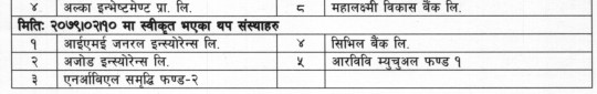योग्य संस्थागत लगानीकर्ताको रुपमा काम गर्न स्वीकृति पाएका कम्पनीहरुमा आईएमई जनरल इन्स्योरेन्स, अजोड इन्स्योरेन्स, सिभिल बैंक, आरबीबी म्युचुअल फण्ड १ र एनआइबीएल समृद्धि फण्ड २ रहेका छन् ।