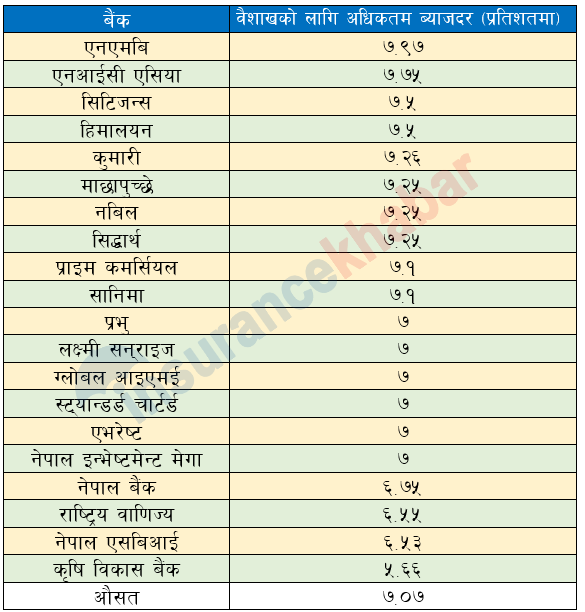एक पटकमा १० प्रतिशतसम्म मात्रै ब्याजदर घटबढ गर्न पाउने राष्ट्र बैंकको नियन्त्रित व्यवस्थानुसार ब्याजदर घटाउँदै सार्वजनिक गर्दै आएका छन् । केही महिनायता निक्षेपको ब्याजदर निरन्तर घटेका कारण बैंकहरुको बेस रेट पनि घट्दै गएको हो । बैशाखमा व्यक्तिगत मुद्दति निक्षेपमा अधिकतम ७.०७ प्रतिशत ब्याज दिइरहेका छन् । आगामी महिनाहरूमा बैंक ब्याजदर झनै घट्ने देखिन्छ ।