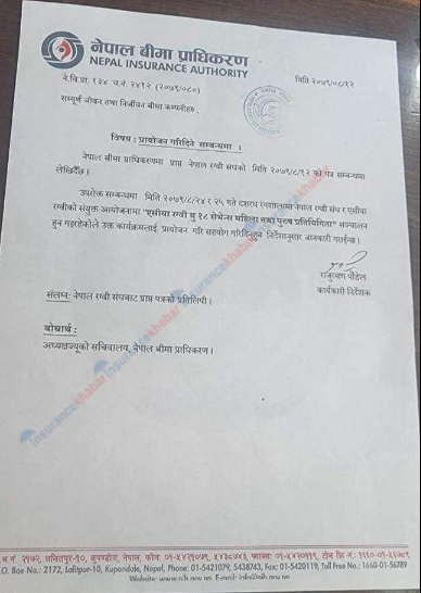 तर, प्राधिकरणले मंसिर २४ र २५ गते दशरथ रङगशालामा नेपाल रग्वी संघ र एसिया रग्वीको संयुक्त आयोजनामा हुन लागेको “एसीया रग्वी यु १८ सेभेंस महिला तथा पुरुष प्रतियोगिता”को प्रायोजन गर्न ३७ बीमा कम्पनीहरुलाई प्राधिकरणका कार्यकारी निर्देशक राजुरमण पौडेलले मंसिर १२ गते पत्र लेख्दै निर्देशन दिएका छन् ।