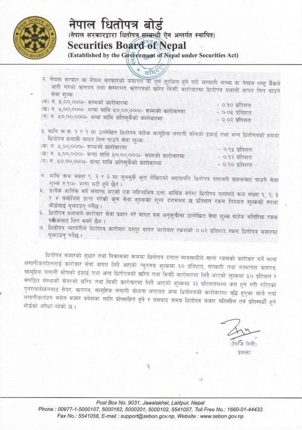 त्यस्तै, नेपाल सरकार वा नेपाल सरकार जमानत वा पूर्ण सुरक्षित हुने गरि सरकारी संस्था वा नेपाल राष्ट्र बैंकले जारी गरेको ऋणपत्रको खरिद बिक्रि गर्दा भितोपत्र दलालले ५ लाख सम्मको कारोबार गर्दा ० दशमलव १० प्रतिशत, ५ लाख देखि माथि ५० लाखसम्मको कारोबार गर्दा ० दशमलव ०५ प्रतिशत र ५० लाख भन्दा माथि जतिसुकै कारोबार गर्दा पनि ० दशमलव ०२ प्रतिशत मात्र सेवा शुल्क लिन पाउनेछन् ।