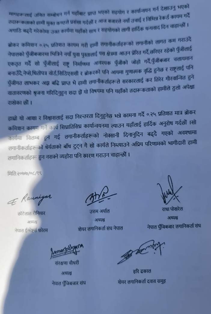 ब्रोकर कमिशन ० दशमलव २५ प्रतिशत कायम गरी लगानीकर्ताहरुको लगानीको लागत कम गराउँदै नेपालको पूँजीबजारमा भित्रिने नयाँ युवा पुस्तालाई यस क्षेत्रमा आउन प्रेरित गर्नुपर्ने, छरिएर रहेका पूँजीलाई एकीकृत गर्दै सो पूँजीलाई राष्ट्र निर्माणको लागी जोहो गर्नुपर्ने लगानीकर्ता सङ्गठनका प्रतिनिधिहरूले बताएका छन्।