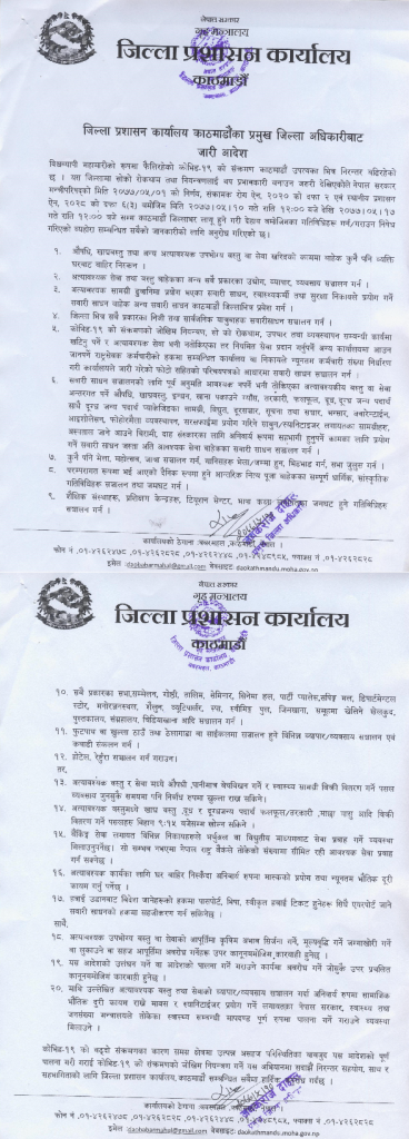 यसअघि ३ भदौको मध्यरातिबाट लागू हुने गरी सुरु भएको निषेधाज्ञा बुधबार सकिँदै थियो । कोरोनाको संक्रमण काठमाडौं उपत्यका भित्र निरन्तर बढिरहेकोले यसलाई रोकथाम तथा नियन्त्रण गर्न उक्त निर्णय भएको काठमाडौं जिल्ला प्रशासन कार्यालयले जनाएको छ ।