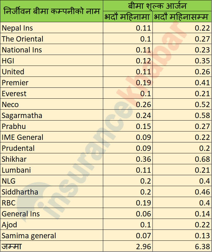 भदौ महिना सम्ममा सबैभन्दा धेरै शिखर इन्स्योरेन्स कम्पनीले ६८ करोड रुपैयाँ बीमा शुल्क आर्जन गरेको छ । भदौ महिनामा मात्रै भने ३६ करोड रुपैयाँ बीमा शुल्क आर्जन गरेको छ । त्यस्तै सबैभन्दा धेरै बीमा शुल्क आर्जन गर्ने दोस्रो नम्बरमा सगरमाथा इन्स्योरेन्स रहेको छ । सगरमाथाले भदौ महिनासम्ममा ५८ करोड रुपैयाँ तथा भदौ महिनामा मात्रै भने २४ करोड रुपैयाँ बीमा शुल्क आर्जन गरेको छ ।