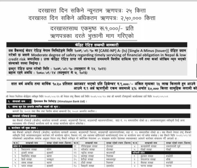 काठमाडौं । हिमालयन बैंकले लिमिटेडले भदौ १५ गतेदेखि वार्षिक १०.५० प्रतिशत ब्याजदरमा ऋणपत्र निष्काशन गर्ने भएको छ । बैंकले ‘हिमालयन बैंक लिमिटेड बण्ड २०८६’ निष्काशन गर्न लागेको हो । बैंकले प्रतिकित्ता १ हजार रुपैयाँ अंकित मूल्यका २ अर्ब ५० करोड रुपैयाँ बराबरको २५ लाख कित्ता ऋणपत्र निष्काशन गर्नेछ । ऋणपत्रको अवधि ७ वर्ष रहनेछ ।