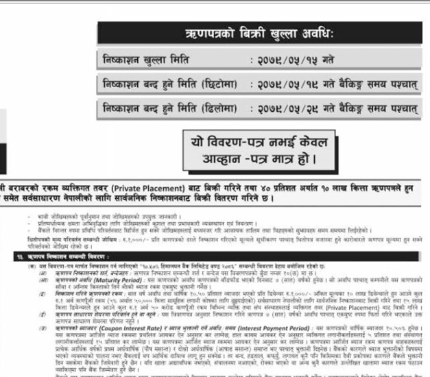जसमध्ये ४० प्रतिशत अर्थात १ अर्ब रुपैयाँ बराबरको १० लाख कित्ता सर्वसाधारणलाई विक्री गरी बाँकी ६० प्रतिशत अर्थात १ अबै ५० करोड रुपैयाँ बराबरको १५ लाख हजार कित्ता व्यक्तिगत तवरबाट विक्री गरिने बैंकले जनाएको छ । सर्वसाधारणलाई निष्काशन गरिने ऋणपत्रमध्ये ५ प्रतिशत अर्थात ५० हजार कित्ता ऋणपत्र सामूहिक लगानी कोषहरुका लागि छुट्याइएको छ ।