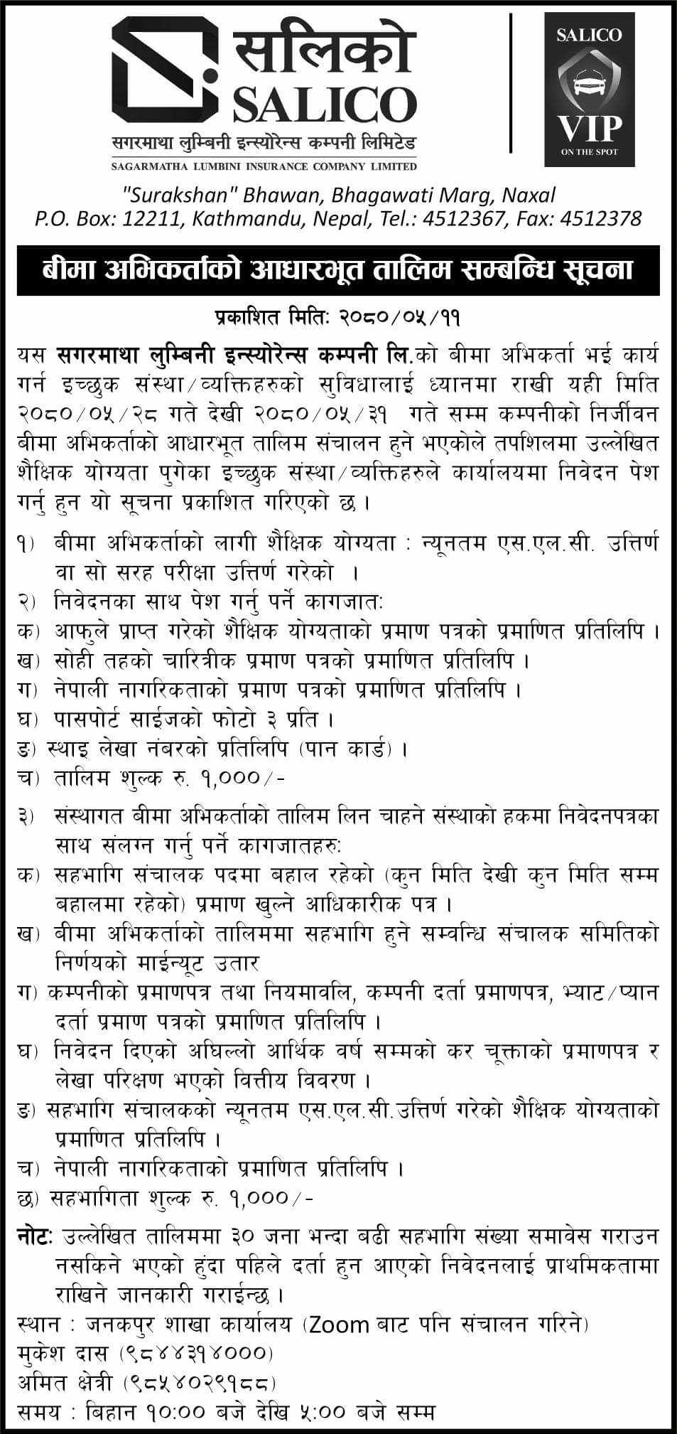 उक्त तालिम जनकपुर शाखा कार्यालयबाट, जुमबाट पनि सहभागी हुन सकिनेछ । तालिम विहान १० बजेदेखि वेलुका ५ बजेसम्म संचालन हुनेछ । सहभागिता शुल्क १ हजार रुपैयाँ लाग्नेछ । अभिकर्ताको लागि न्युनतम एसएलसी उर्तिण वा सो सरह परीक्षा उर्तिण गरेको हुनुपर्नेछ ।