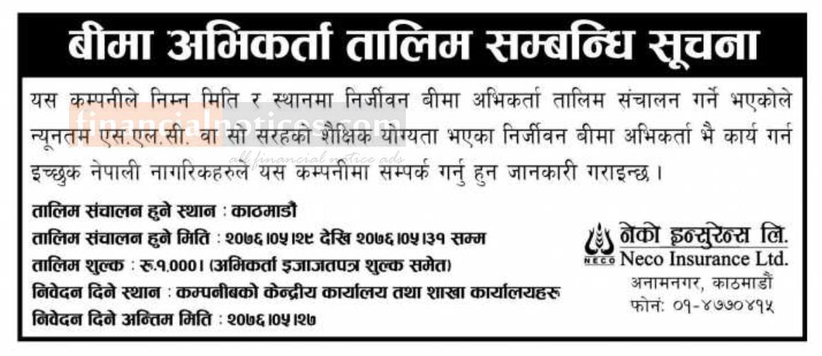 इन्स्योरेन्स कम्पनीले उक्त तालिम काठमाडौंमा संचालन गर्न लागेको हो । उक्त तालिम भदौ २९ गतेदेखि भदौ ३१ गतेसम्म संचालन गर्ने जनाएको छ । तालिम शुल्क १ हजार रुपैयाँ लाग्ने कमपनीले जनाएको छ ।