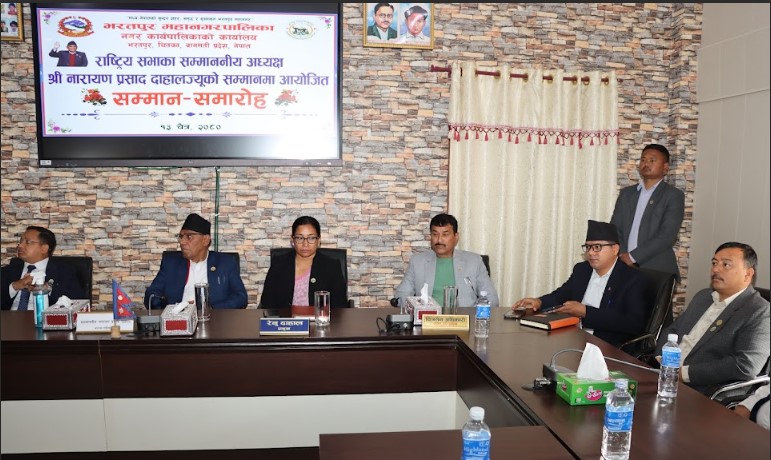 काठमाडौं । राष्ट्रिय सभाका नवनिर्वाचित अध्यक्ष नारायणप्रसाद दाहाललाई भरतपुर महानगरपालिका कार्यालयमा स्वागत तथा सम्मान गरिएको छ । मंगलबार भरतपुर महानगरपालिका सभाहलमा एक कार्यक्रमका बीच अध्यक्ष दाहाललाई स्वागत तथा सम्मान गरिएको हो ।