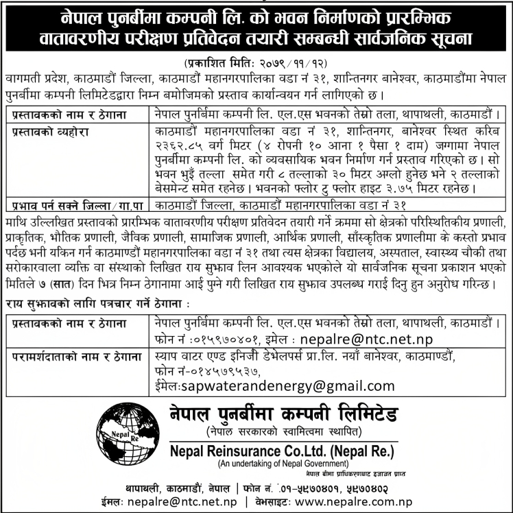 वातावरणीय प्रभाव मूल्यांकनका लागी गत शनिबार स्थानीबासिन्दासँग सार्वजनिक सुनुवाई गरेकाे नेपाल पूनर्बीमाले ८ तल्ला अग्लाे भवन निर्माणका कारण परिस्थिकीय प्रणाली, जैविक, आर्थिक, भाैतिक, सांस्कृतिक, सामाजिक प्रणालीमा पर्न सक्ने संभावित प्रभावका सम्बन्धमा लिखित सुझाव मागेकाे हाे । पूनर्बीमाले शुक्रबार सार्वजनिक सूचना मार्फत् सात दिनभित्र लिखित सुझाव पेश गर्न अनुराेध गरेकाे छ।