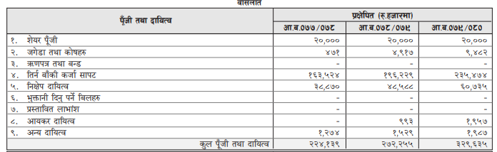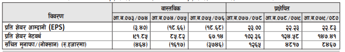 प्रक्षेपित तथ्यांक अनुसार आर्थिक वर्ष ७७/७८ मा प्रति शेयर आम्दानी २३ रुपैयाँ र किताबी मूल्य १०२ रुपैयाँ ३६ पैसा हुन्छ। आर्थिक वर्ष ७८/७९ मा भने प्रति शेयर आम्दानी २२ रुपैयाँ २३ पैसा र किताबी मूल्य १२४ रुपैयाँ ५८ पैसा र आर्थिक वर्ष ७९/८० मा भने प्रति शेयर आम्दानी २२ रुपैयाँ ८३ पैसा र किताबी मूल्य १४७ रुपैयाँ ४१ पैसा हुने कम्पनीले प्रक्षेपण गरेको छ।