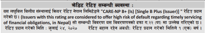 यस लघुवित्त वित्तीय संस्थालाई कियर रेटिङ्ग नेपाल लिमिटेडले “CARE-NP B+ (Is) [Single B Plus (Issuer)] ” रेटिङ्ग प्रदान गरेको छ।