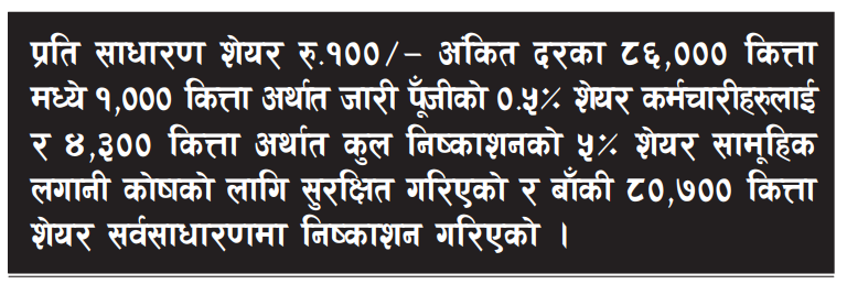 काठमाडौं । समाज लघुवित्तले प्रति साधारण शेयर रु १०० अंकित दरका ८६,००० कित्ता मध्ये १,००० कित्ता अर्थात जारी पूँजीको ०.५ प्रतिशत शेयर कर्मचारीहरुलाई र ४,३०० कित्ता अर्थात कुल निष्काशनको ५ प्रतिशत शेयर सामूहिक लगानी कोषको लागि सुरक्षित गरिएको र बाँकी ८०,७०० कित्ता शेयर सर्वसाधारणमा निष्काशन गरेको छ ।