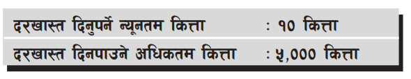 न्युनतम १० कित्ता देखि अधिकतम ५,००० कित्ता सम्म आवेदन दिन सकिन्छ ।