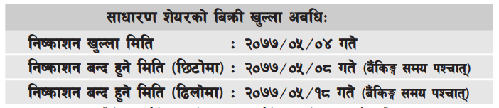 आईपीओ भाद्र ४ गते देखि भाद्र ८ गते सम्म खुल्ने छ । भाद्र ८ गते बैंकिङ्ग समय पश्चात आवेदन दिन सकिने छैन । यदि भाद्र ८ गते सम्म पनि सम्पूर्ण शेयर कित्तामा आवेदन नपरेको अवस्थामा भाद्र १८ गते सम्म समय थपिने छ । विगत देखिको तथ्याङ्क अनुसार समय थपिने सम्भावना एकदमै न्यून जस्तै छ ।