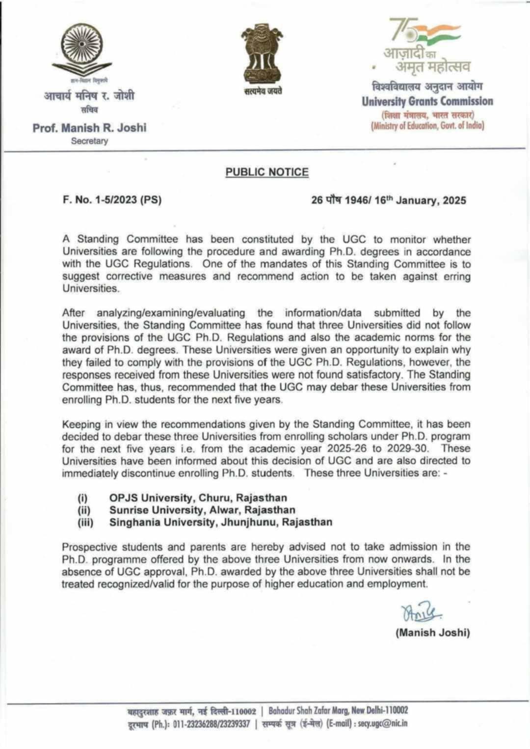 विश्वविद्यालय अनुदान आयोग (यूजीसी)को स्थायी समितिले नियम तोडेको भन्दै ती विश्वविद्यालयलाई पीएचडीको पढाइ सञ्चालन गर्न रोक लगाउने निर्णय गरेको हो। आयोगको कारबाहीमा पर्ने विश्वविद्यालयमा राजस्थानको चुरुस्थित ओपीजेएस, अल्वरस्थित सनराइज र झुन्झुनुस्थित सिंघानिया विश्वविद्यालय छन्।