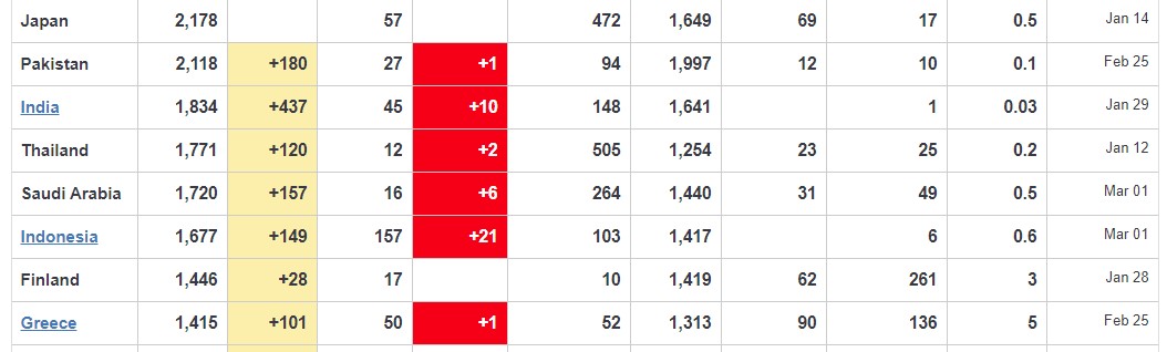 तथ्याङ्क सम्बन्धी प्रायः विश्वास गरिएको वेभसाईट वल्र्डमिटरर्सका अनुसार बुधबार एकै दिन भारतमा १० जनाको कोरोना भाइरसका कारण ज्यान गएको छ । भारतले कोरोना संक्रमण फैलिन २१ दिन लामो लकडाउन घोषणा गरिसकेको छ । यद्यपि लकडाउनलाई उल्लंघन गर्दै लाखौं मजदुरहरु आफ्ना गन्तव्यमा निस्केको समाचार पनि आइरहेका छन् । विश्वको दोस्रो ठूलो जनसंख्या भएको देश भारतमा कोरोना भाइरसको संक्रमण फैलिएमा नियन्त्रण कठिन हुने र मानव जातिकै लागि घातक हुने चेतावनी दिइएको छ ।