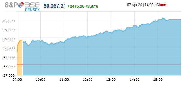 बिएससी सेंसेक्स सूचक २४७६ दशमलव २६ को अंकले वृद्धि भएर ३००६७ दशमलव २१ अंकमा बन्द भएको छ भने यसैगरी निफ्टी सूचक ७०८ दशमवल ४० अंकले वृद्धि भएर ८७९२ दशमलव २० अंकमा पुगेको छ।