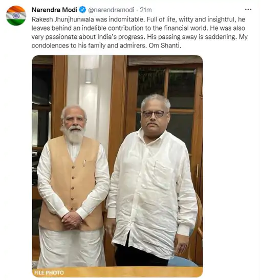 काठमाडौं । भारतीय शेयर बजारका ‘बिग बुल’ राकेश झुनझुनवालाको निधन भएको छ । झुनझुनवालाको ६२ वर्षको उमेरमा आज विहानै मुम्बईमा निधन भएको हो । भारतीय शेयर बजारका लगानीकर्ताको आदर्श पात्रका रुपमा चिनिएका झुनझुनवालाको कुल सम्पत्ती ६५ हजार करोड रुपैयाँभन्दा बढी छ । भारको ३६ औ धनि व्यक्तिका रुपमा चिनिएका उनले शेयर बजारबाटै दैनिक ५ सय करोड काउँथे ।