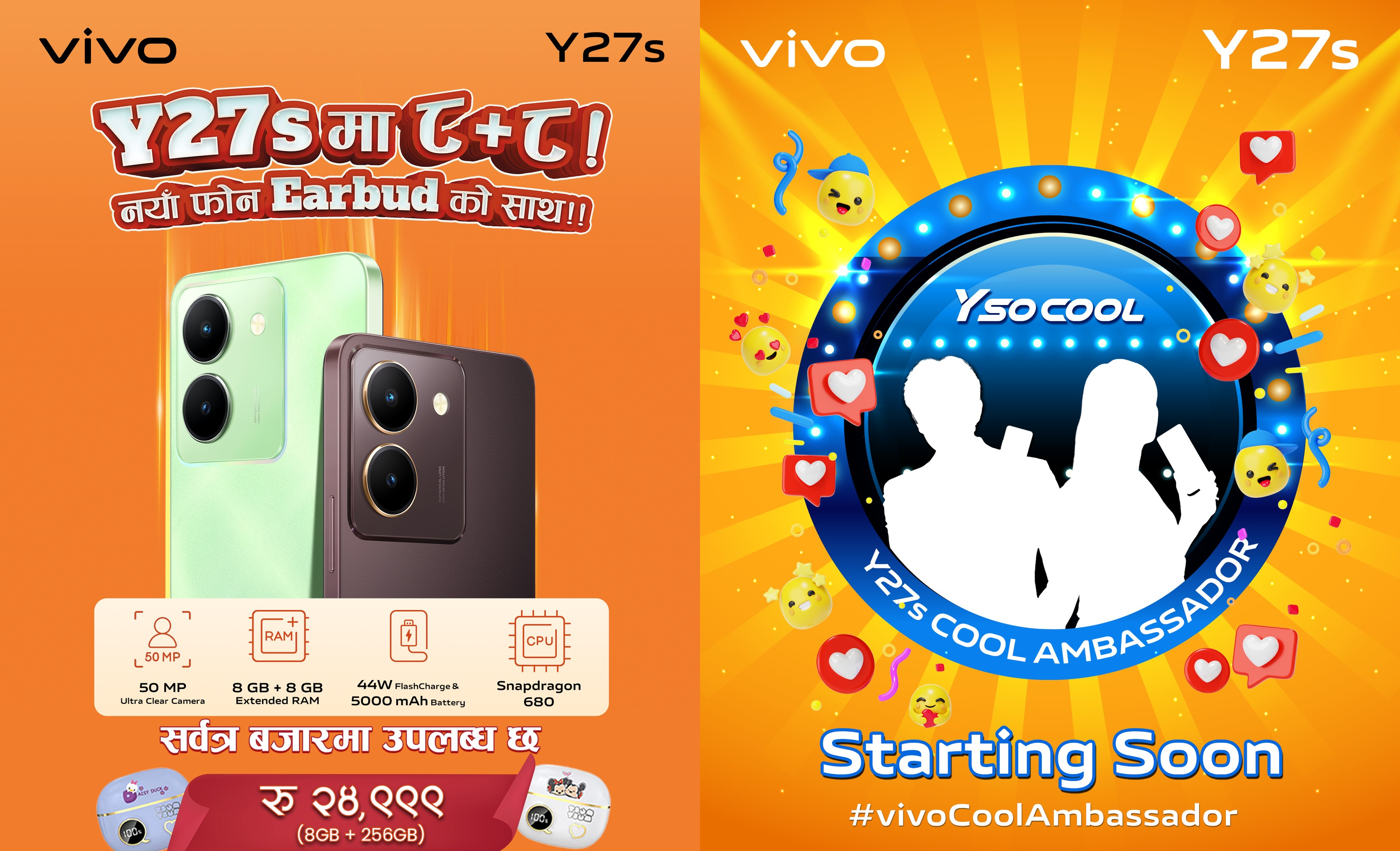 #vivoCoolAmbassador अभियानद्वारा कम्पनीले प्रयोगकर्ताहरुलाई भिडियो बनाएर आफ्नो सामाजिक सञ्जालमा अपलोड गरी भभो वाई सिरिजको कूल एम्बेसेडर बन्न आमन्त्रित गरेकाे छ। सहभागीहरु मध्ये सबैभन्दा बढि मनपराईएको भिडियोबाट पहिलो विजेताले भिभो वाई२७ एस स्मार्टफोन जित्न सक्नेछन् र फोटोसुट गर्ने अवसर पनि प्राप्त गर्नेछन् ।